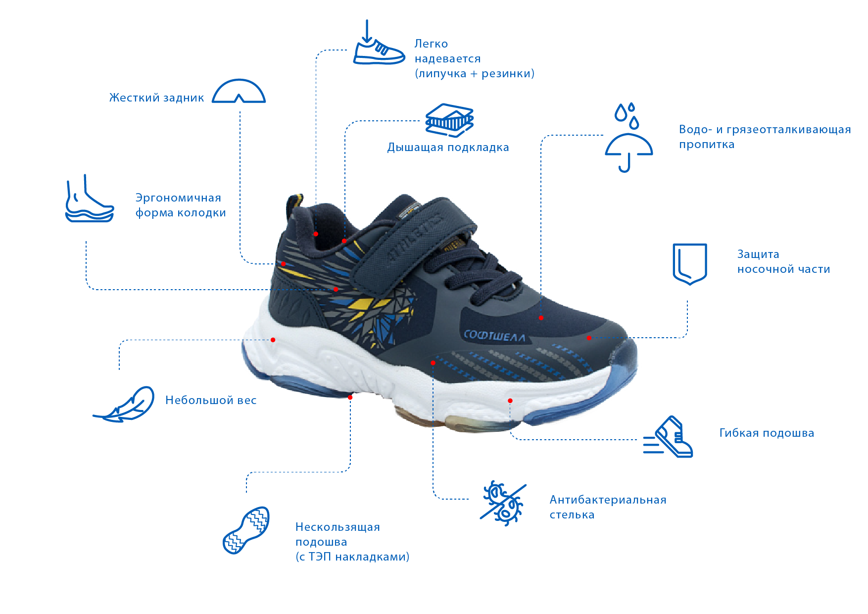 - Антибактериальная стелька: для поглощения неприятных запахов.