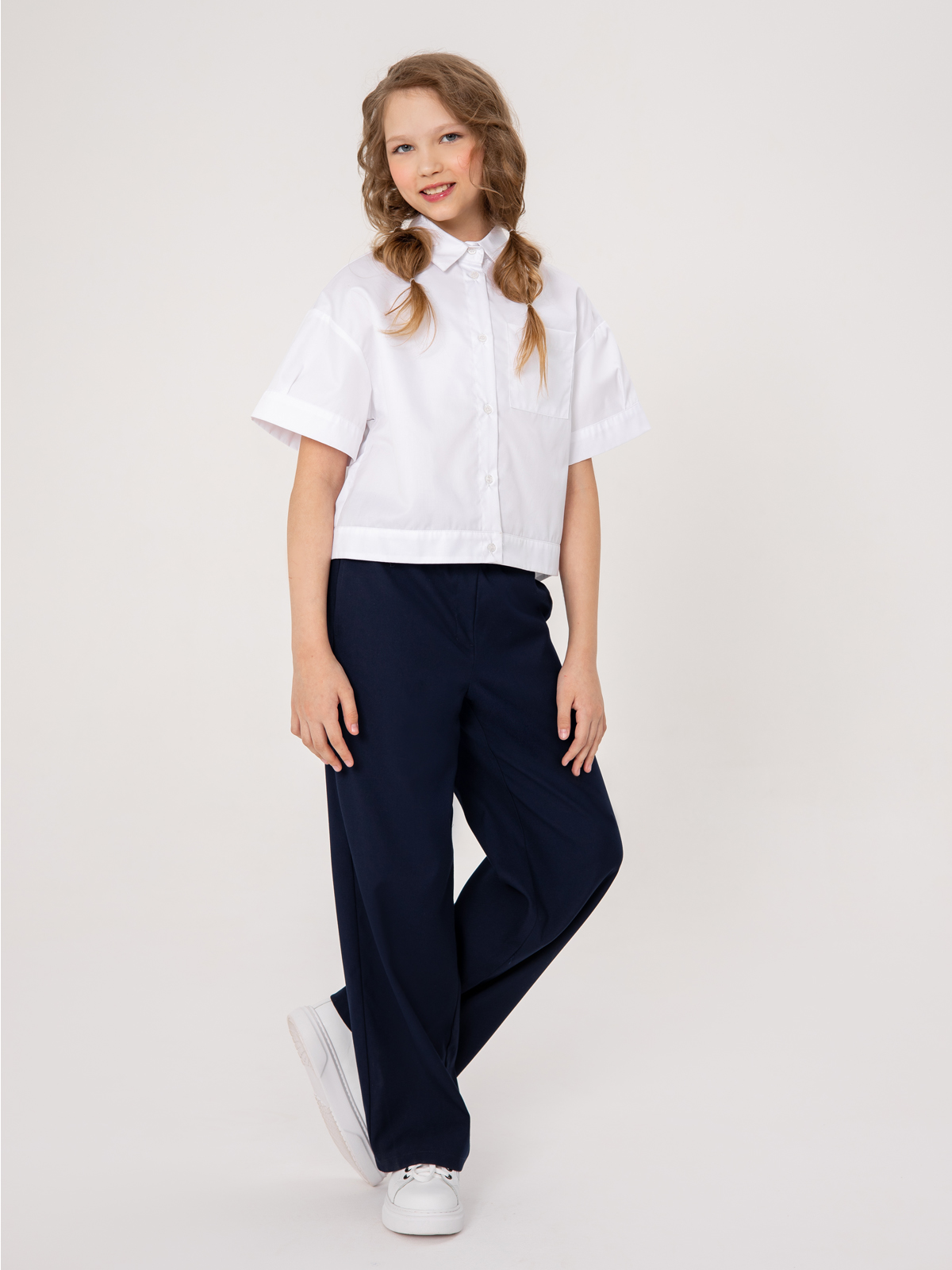 Широкие темно-синие школьные брюки выполнены из высококачественной костюмной поливискозы с высокой воздухопроницаемостью. Ткань плотная, приятная на ощупь, не скатывается, сильно не мнется, износостойкая, не теряет форму и цвет после стирки. Модель брюк для школы легко надевается за счет резинки на поясе, имеет функциональные боковые карманы.