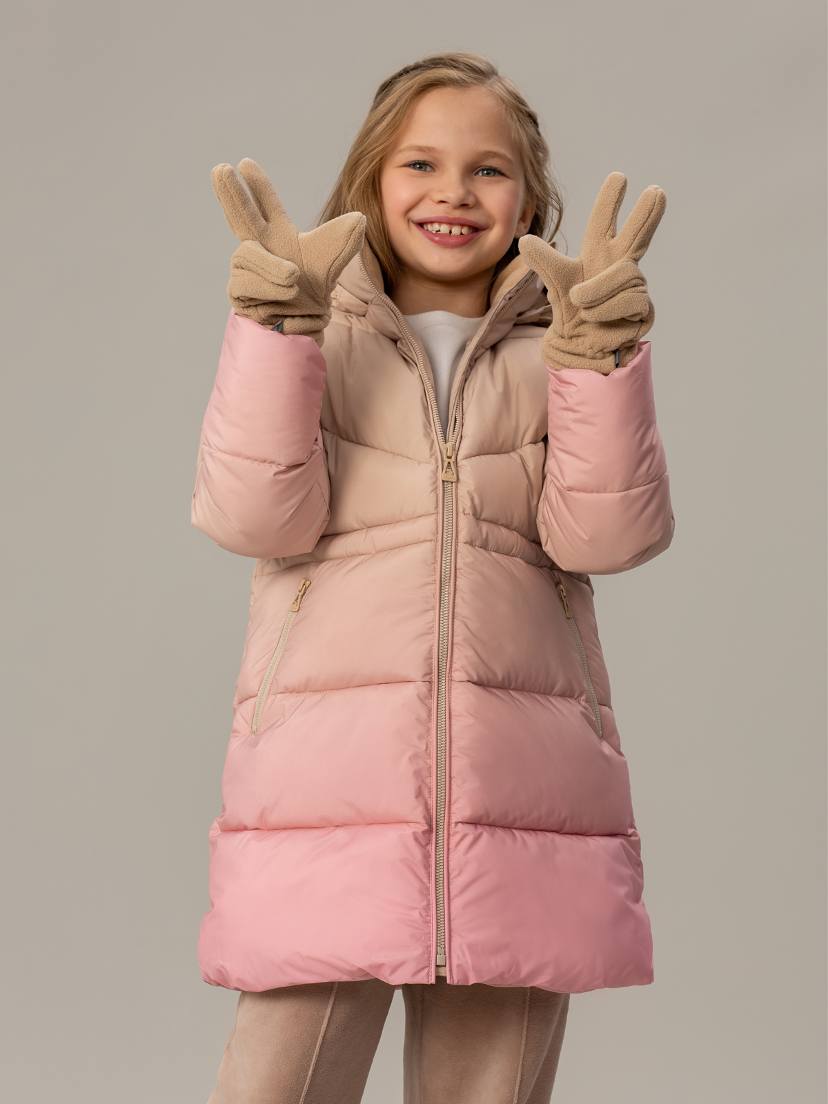 Зимняя куртка для девочки А-силуэта станет незаменимым элементом гардероба в холодное время года. Модель выполнена из ткани с градиентным принтом, плавно переходящим из нежных бежевых в романтичные розовые тона. Ткань верха — с мембраной 5000/5000, которая надёжно защищает от ветра и осадков, при этом обеспечивая отличную воздухопроницаемость. Это позволяет ребёнку чувствовать себя комфортно даже при активном движении. Утеплитель — искусственный пух плотностью 350 г/м², который эффективно сохраняет тепло даже в сильные морозы. Практичные детали включают регулируемый капюшон для дополнительной защиты от непогоды, внутреннюю утяжку по поясу, позволяющую настроить посадку, и трикотажные манжеты, обеспечивающие дополнительное сохранение тепла.