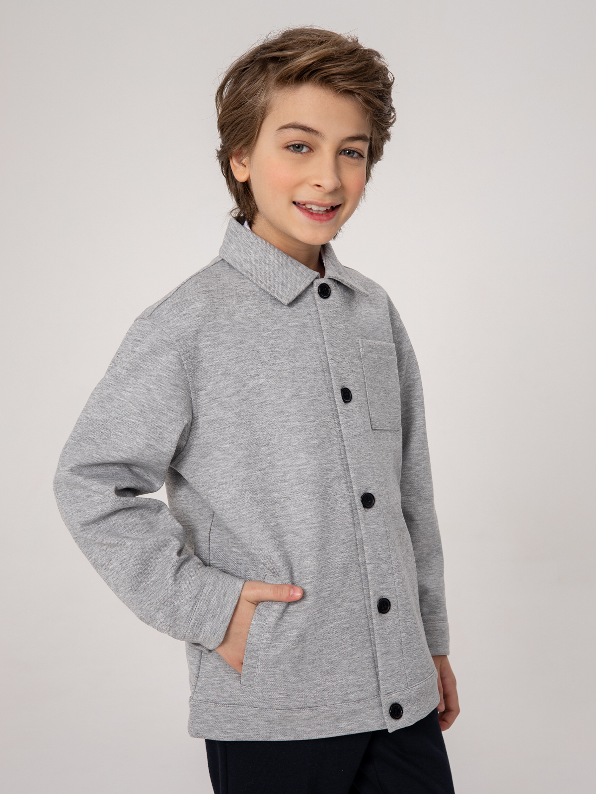 Трикотажный пиджак для школы трендового рубашечного кроя. Выполненный из фактурной поливискозы пиджак позволит свободно двигаться и выглядеть стильно. Тщательно выверенная конструкция, свободный крой и эластичная ткань, позволяют ребенку комфортно находиться в школе длительное время и не чувствовать себя скованно.