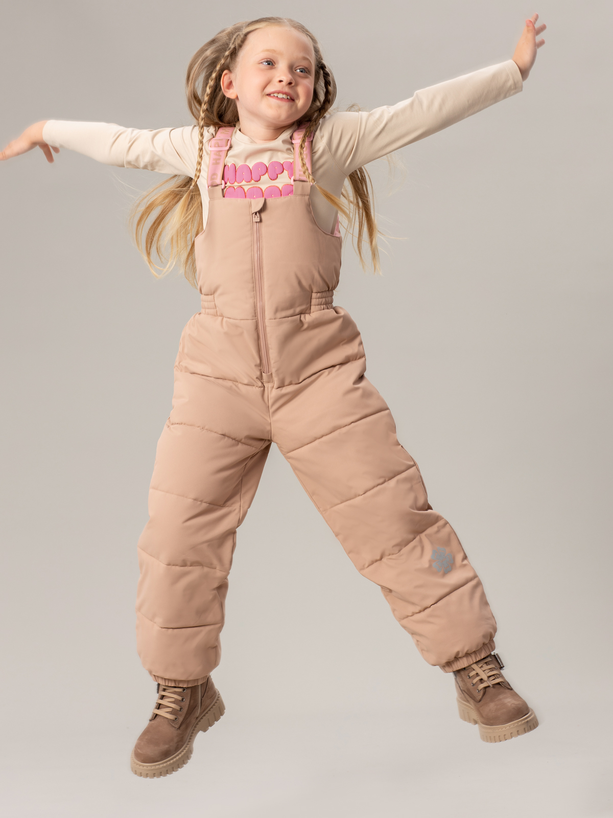 Утеплённый бежевый полукомбинезон для девочки — идеальное решение для зимних прогулок. Выполнен из мембранной ткани 5000/5000, которая надёжно защищает от ветра и осадков. В качестве утеплителя используется искусственный пух плотностью 200 г/м² в сочетании с синтепоном 100 г/м², что обеспечивает отличную теплоизоляцию. Для максимального комфорта внутренняя подкладка изготовлена из мягкого микрофлиса. Регулируемые эластичные лямки обеспечивают удобную посадку, а резинки по низу брючин эффективно защищают от попадания снега. Практичная застёжка на молнию позволяет быстро надевать и снимать изделие. Этот полукомбинезон станет незаменимым элементом гардероба ребенка в холодное время года.