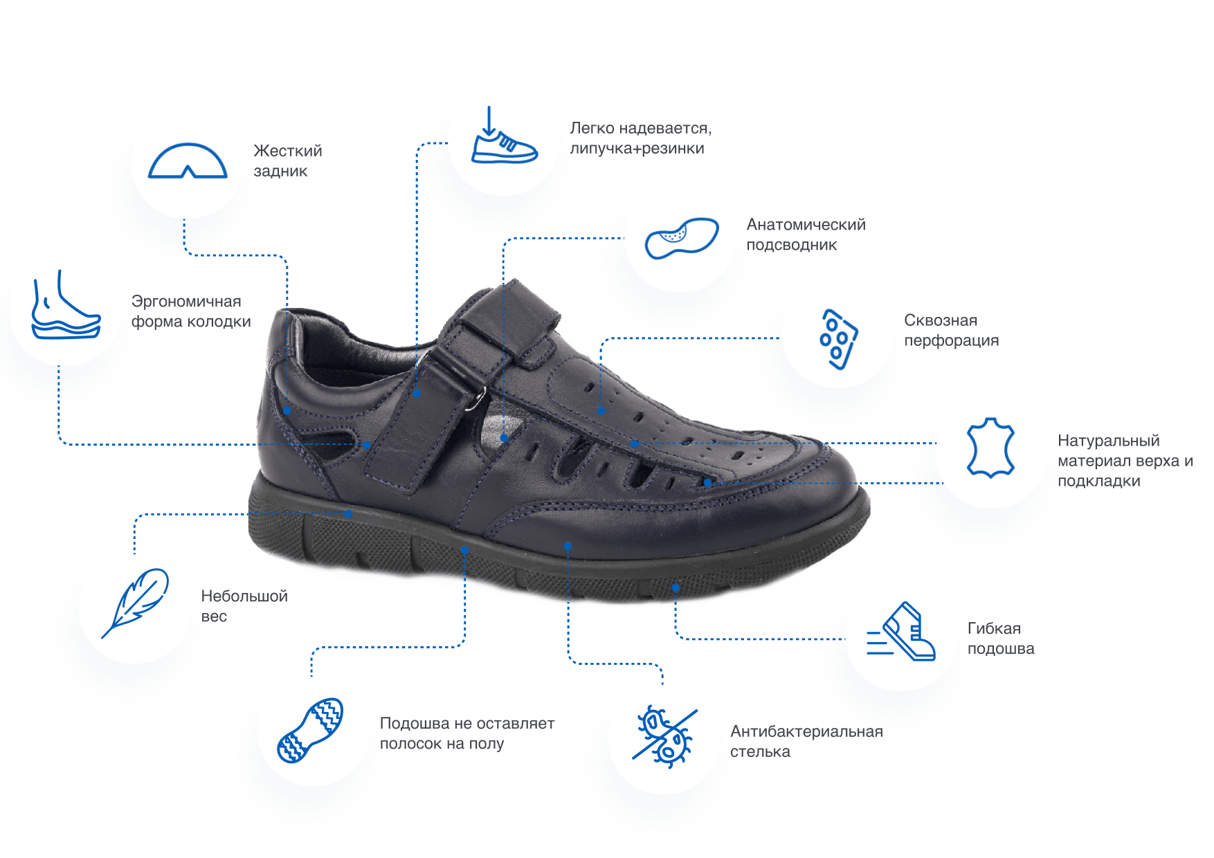 - Индивидуальность. На сандалиях есть липучки: с их помощью даже маленький мальчик может отрегулировать обувь по полноте.