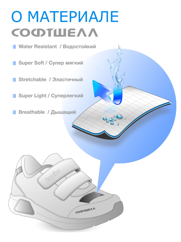 Обувь с софтшелл предназначена для активных детей для дополнительной защиты от влаги - в такой обуви не промокнуть под внезапно начавшимся дождиком или при беге по мокрой траве!