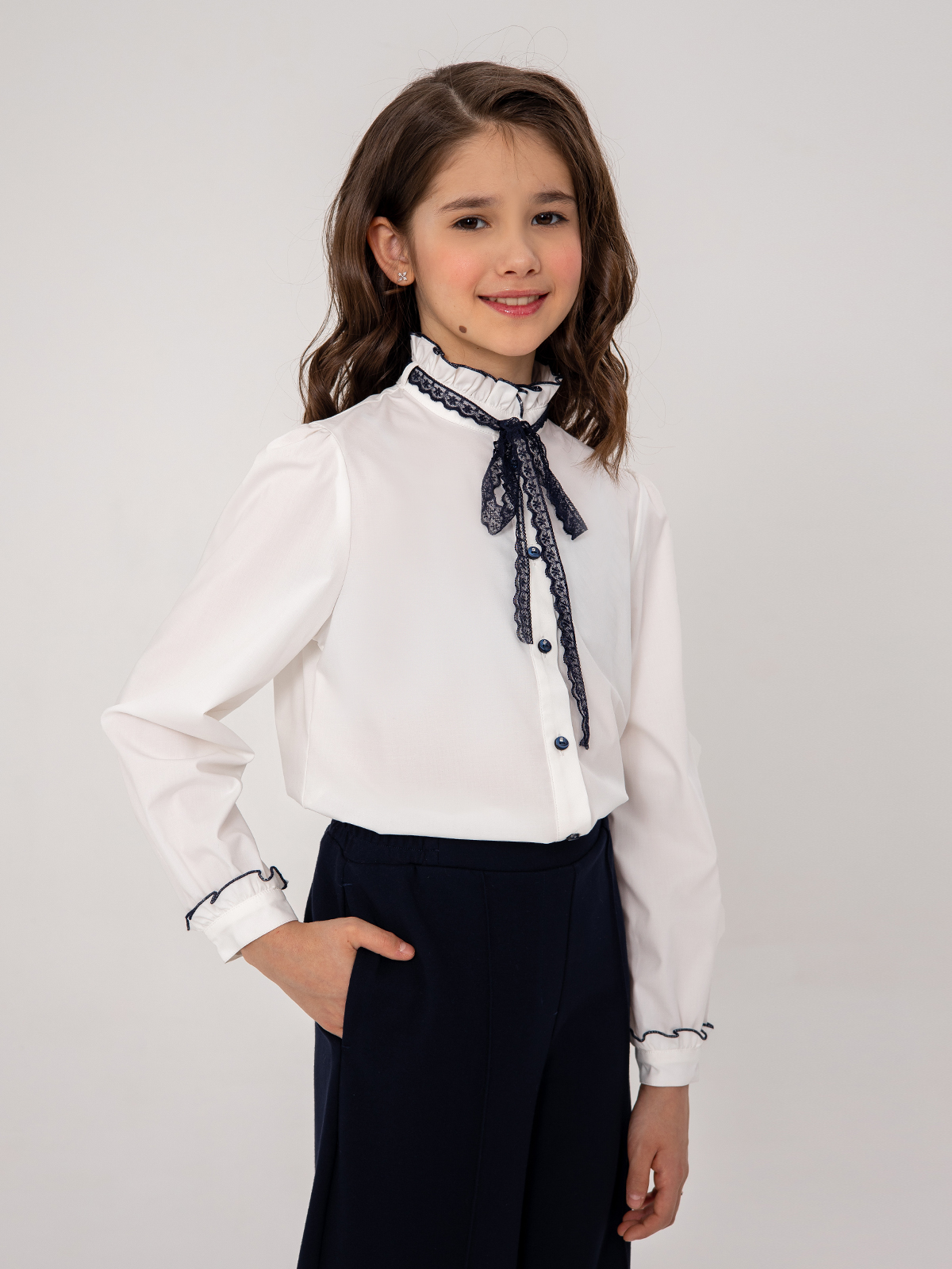 Классическая белая школьная блузка выполнена из мягкой ткани с высоким содержанием волокон бамбука. Ткань мягкая и дышащая не сковывает движения, приятна к телу, мало мнется и легка в уходе. Добавление эластана создает комфорт и удобство. Нарядная школьная блузка свободного силуэта дополнена вставками из рюш на рукавах, стойке воротника, декорированна кружевным бантом.