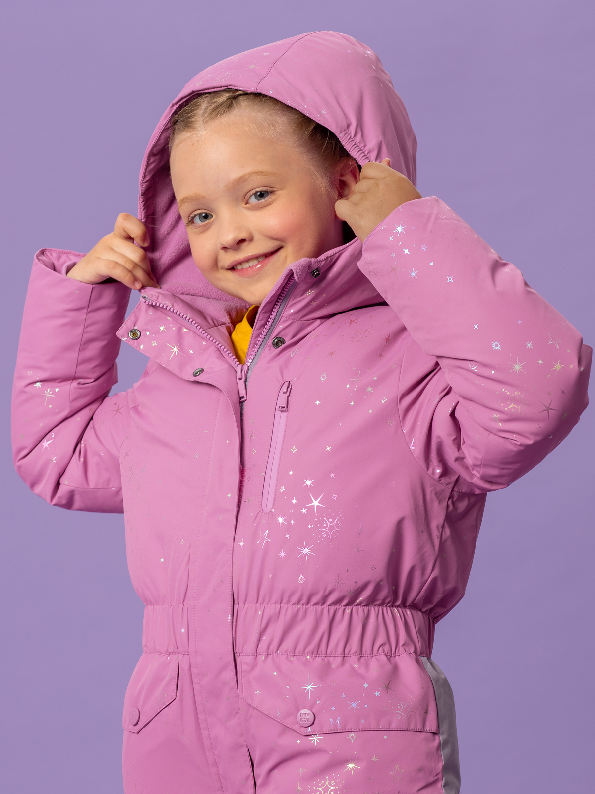 Практичный утеплённый комбинезон в розовом и сером цветах с эффектным голографическим принтом. Прочная мембранная ткань с показателями 5000/5000 надёжно защищает от влаги и ветра, обеспечивая комфортный микроклимат. Современный утеплитель из искусственного пуха плотностью 350 г/м² гарантирует сохранение тепла в прохладную погоду. Удобная молния в сочетании с ветрозащитной планкой обеспечивает простоту использования. Функциональные карманы с клапанами на кнопках позволяют хранить необходимые вещи. Эластичная резинка на талии обеспечивает комфортную посадку по фигуре. Регулируемый капюшон позволяет настроить оптимальную защиту от непогоды. Светоотражающие элементы повышают безопасность в тёмное время суток.
