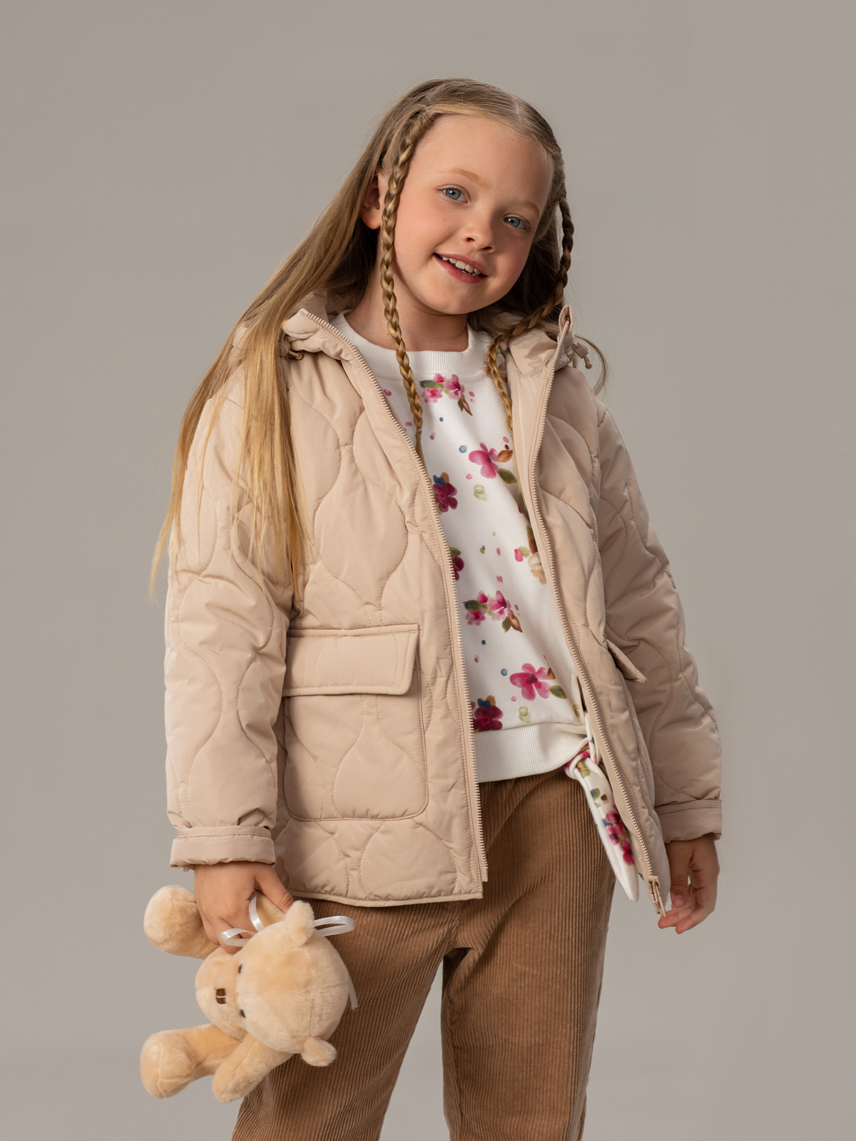 Стильная стеганая куртка в бежевом цвете. Благодаря удобному крою и практичным решениям эта модель станет незаменимым элементом гардероба. Высокотехнологичная ткань с мембраной 5000/5000 гарантирует отличную защиту от влаги и позволяет коже дышать, а синтепон плотностью 160 г/м² обеспечивает оптимальный баланс тепла и лёгкости изделия. Куртка имеет удобный капюшон для дополнительной защиты от непогоды и два функциональных накладных кармана с клапанами. Эта куртка станет отличным выбором для активных девочек, которые ценят комфорт и практичность. Модель прекрасно подойдёт как для детского сада, так и для прогулок на свежем воздухе.
