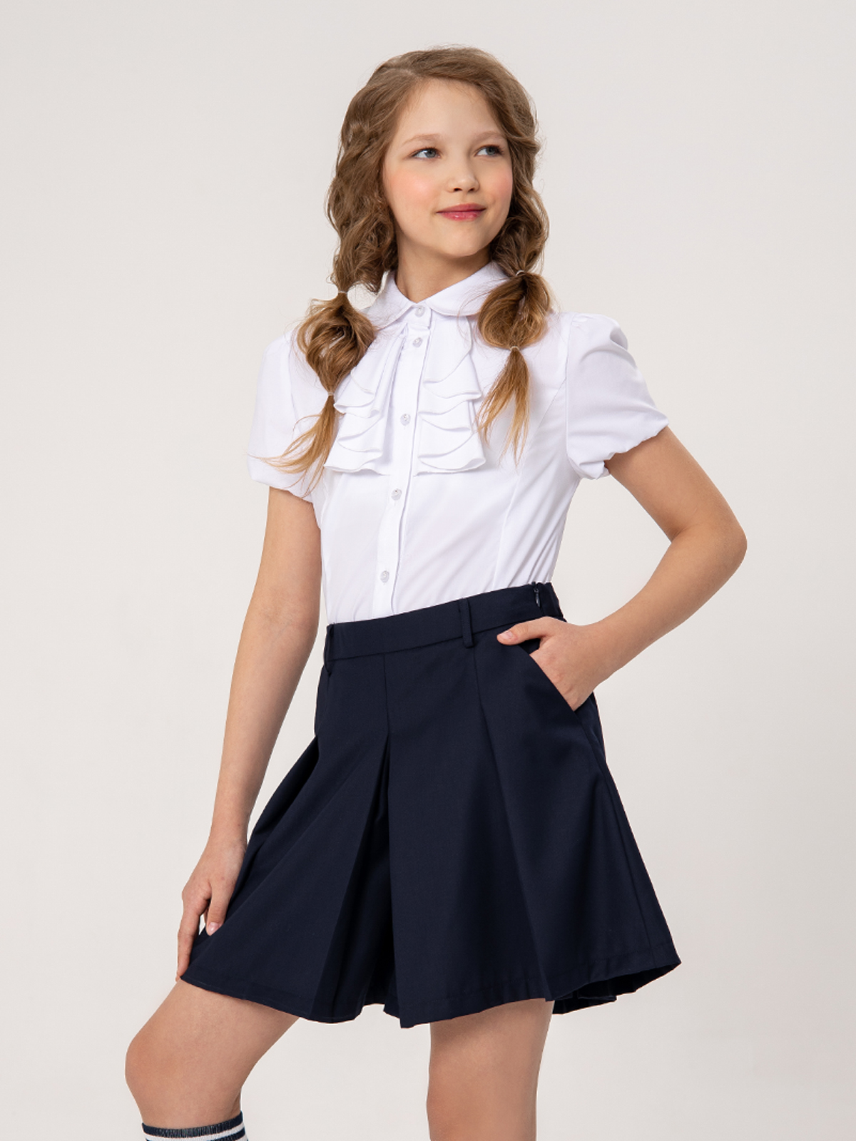 Школьная юбка-шорты выполнены из высококачественной костюмной поливискозы с высокой воздухопроницаемостью. Ткань плотная, приятная на ощупь, не скатывается, сильно не мнется, износостойкая, не теряет форму и цвет после стирки. Карманы со скосами на передней части способствуют удобной эксплуатации. Шорты имеют возможность регулировки по талии за счет, вставленной внутрь резинки с перфорационными отверстиями.